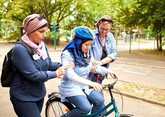 Für jede Fahranfängerin braucht es doppelt so viele Frauen, die links und rechts stützen, erklären, schieben und Sicherheit geben. „Neben der Körperarbeit ist es eine Vertrauenssache. Das Tolle ist: Die Frauen haben hinterher richtige Glücksgefühle, weil sie hier etwas Neues entdecken. Sie haben viel verloren in der Vergangenheit, das Radfahren ist etwas Neues, was sie hier gewinnen können“, so Annette Krüger. Das Erfolgserlebnis sorgt mitunter für Freudentränen bei allen Beteiligten, berichtet sie. Die Kurse stärken das Selbstbewusstsein und ermöglichen individuelle Mobilität, mehr Teilhabe und Unabhängigkeit.